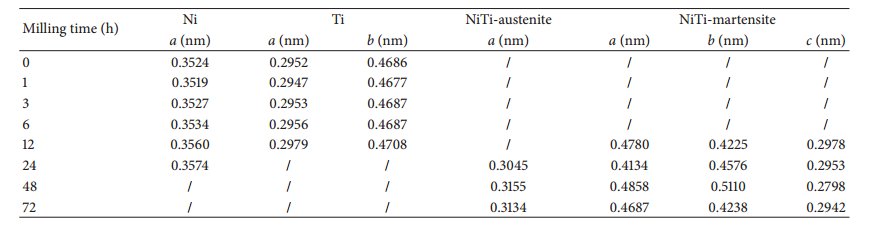 在前1h,碰撞導致Ni和Ti的晶格減少,但在接下來到24h的階段里又會增加,這可能是由于在研磨過程中,結構缺陷的累積增多和幾種塑性變形。奧氏體增加并保持一個相對穩定的值,比馬氏體的要高,這也可能是因為不同類型的缺陷造成的。