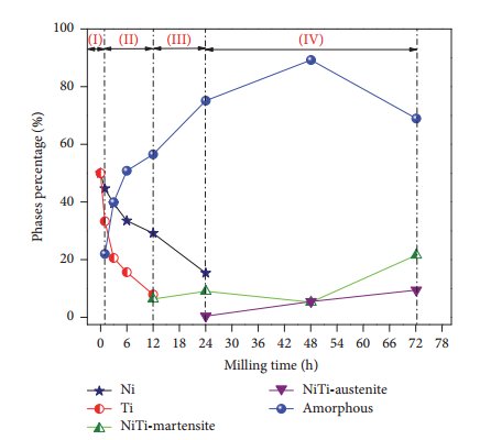 Ni-SS的比例減少,相反地,非晶相開始增加。12h-24h階段:Ni-SS繼續減少,Ti-ss已經徹底消失,非晶繼續增加,開始形成馬氏體。隨著研磨的進行,幾種變形的相完全轉化為了非晶體結構。通過機械強化的非晶體結構,有不同的物性,點缺陷,空穴,填隙,晶格缺陷,位移。24h-72h階段:Ni-ss消失,形成奧氏體。NiTi馬氏體減少而非晶形的增加。在48h后,非晶因為形成更穩定的奧氏體和馬氏體而減少,可能是因為能量和溫度的升高。最終的非晶相在89.23%。