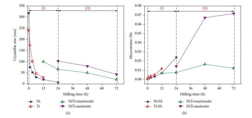 a:研磨時間越長,粒徑減少,內應力增加。在早期階段,晶體粒徑在24h達到7nm,Ni-ss和Ti-ss的12h時達到29nm。而且Ni-ss的大小比Ti-ss的要減少的快,可能是因為初始直徑Ni比Ti要小。在24h后,晶體大小不在因為研磨時間有大的變化,可能是因為機械能不足以使奧氏體和馬氏體發生形變。粒徑的減小可能是因為研磨破碎了部分粒子。增加的成核概率是因為更高的缺陷密度。