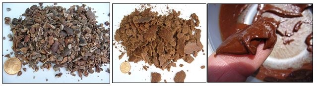 使用臼式研磨機處理可可粗粉,由于是溫和研磨,樣品溫度不會升高,基本與周圍環境相同,研磨過程中只有部分油脂從可可顆粒中擠壓出來,最終可可粗粉形成薄片狀,如下圖中間圖片所示。