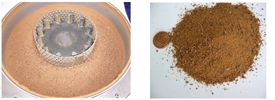 此實驗的目的為將可可粗粉進一步研磨至可加工處理的可可細粉,由于可可粗粉在反復研磨過程中會滲出可可油,因此選用上述所提及到的兩個方案處理可可粗粉通常會得到可可漿。所以這里我們建議選用可變速旋轉粉碎機 PULVERISETTE 14 進行這個實驗。如圖所示,示例中選用篩網為2mm篩網,處理樣品量為100g,處理時間為1min,下圖左圖片可以看到,可可粗粉均被破碎為可可細粉,并且收集盤中仍有較多剩余空間,說明單批處理量可以更多。 樣品處理量為2kg時,您可以選擇分批次處理,也可以選擇為設備安裝一個專門應用于大批量樣品處理的轉換接口,進行連續處理。