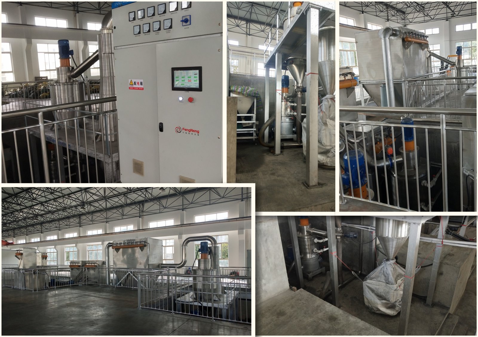 該生產線全部采用不銹鋼制作,由磨粉機、球化設備以及氣流輸送系統三大組件組成。全系統采用PLC控制,一鍵啟停,一點投入原料,一點收集破碎球化后的粒度分布合格、顆粒形貌合格、振實密度和比表面積合格的成品,其間的加料、破碎分級、球化投料、球化整形、半成品及成品輸送等全部自動完成。可加工D50=8-22微米間、并同時滿足D10和D90粒度分布的任意粒度要求,綜合成品率最高可至85-90%左右。