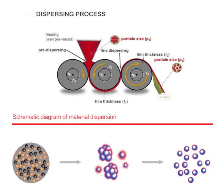 三輥研磨機由三個水平放置的輥子組成,它們以相反的方向和不同的速度旋轉。需要研磨的材料被放置在進料輥和中心輥之間,并通過附著力從中心輥轉移到圍裙輥上。相鄰軋輥之間的剪切力產生分散作用,減少輥子之間的距離會產生更大的剪切力,但也會降低產量。間隙設置在0.001英寸范圍內是很常見的。碾磨過的材料被一把輥刀從圍裙輥上刮下。這個循環可以重復進行,以改善分散性或直到達到粒度平衡。三輥研磨機是一種經典的技術,其產量本身較低,需要熟練的操作人員,但它仍然是制備涂料、油墨、化妝品、軟膏、牙科合成物和其他粘性材料中非常精細的顆粒分散體的最佳方法之一。