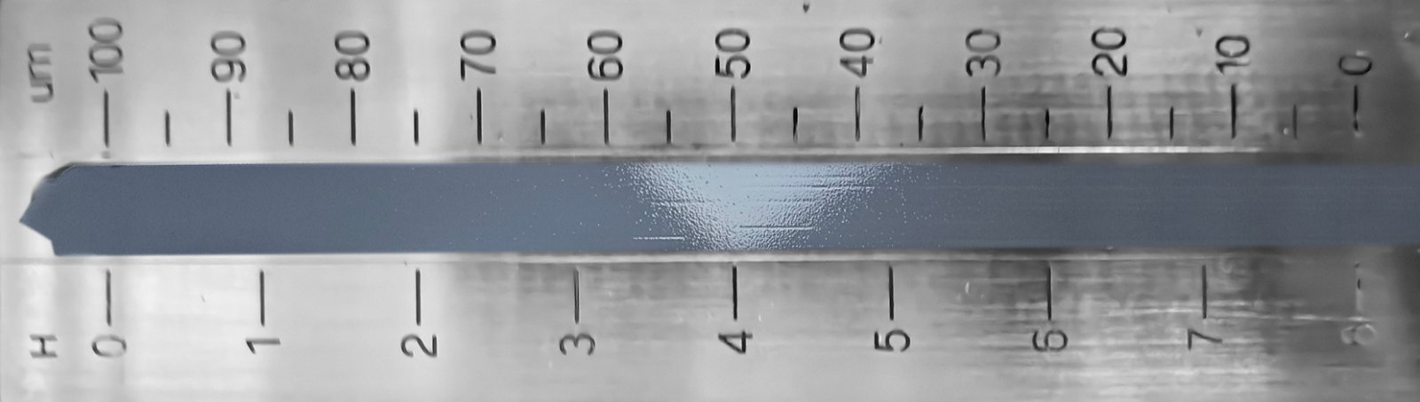 3、出料檢測 取少量研磨后的材料再使用刮板細度計進行檢測,刮板細度12μm,如下圖所示: