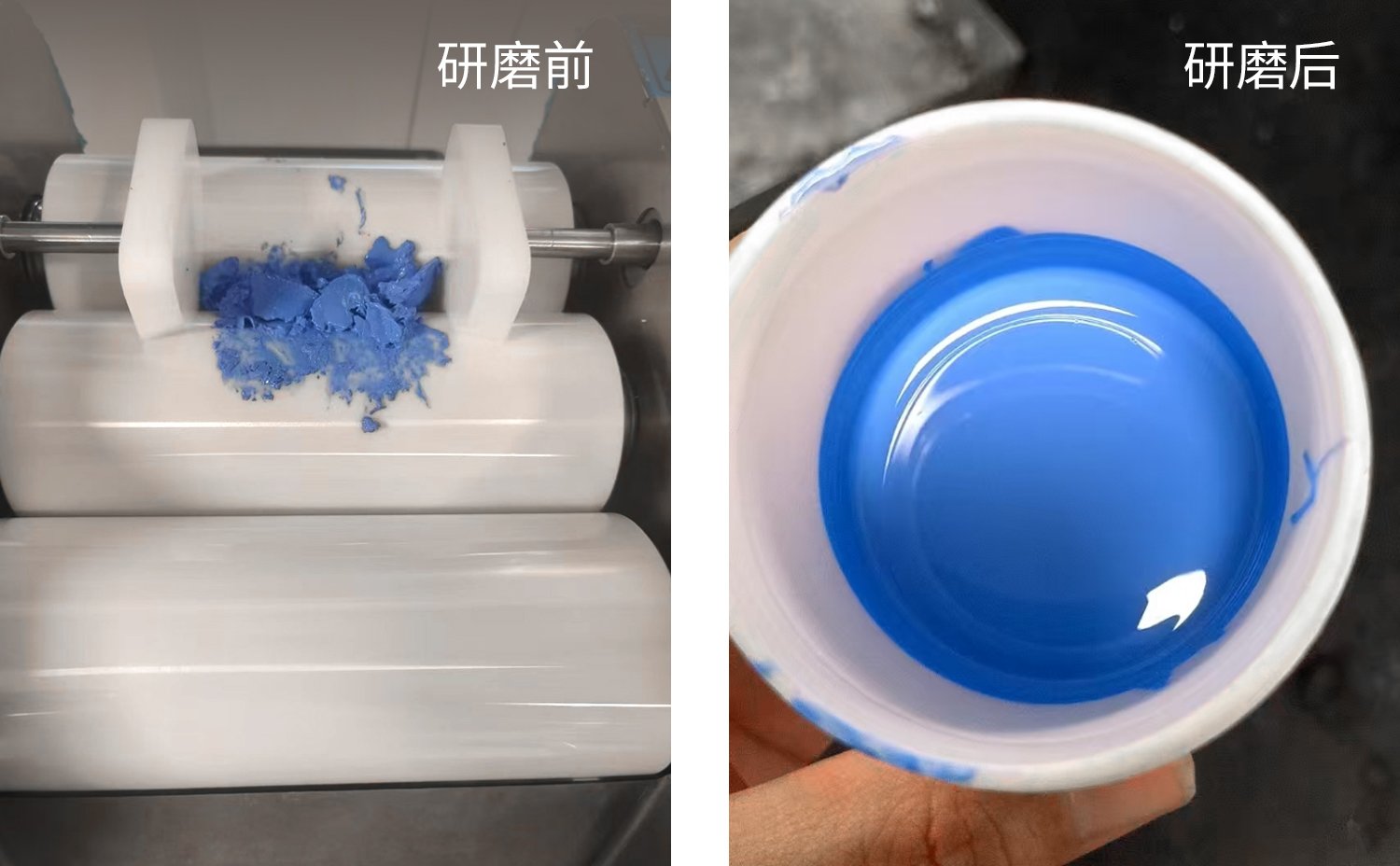 2、三級分散工藝 使用ZYTR-80E Plus 三輥機通過三級分散工藝進行漿料的分散和均質,確保粒徑穩定控制在 15μm 以下,并顯著提升漿料的光澤度與流變性能。 ① 粗輥階段:輥距50-25μm ② 二次精磨:輥距30-15μm ③ 終極均質:輥距10-5μm 三輥機運行過程中出料均勻無漏料,如下圖所示: 介質漿料研磨前后效果