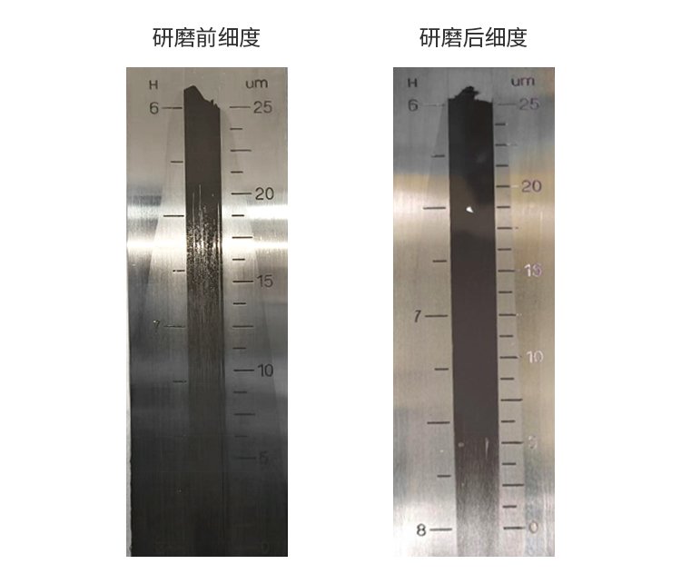 實驗材料:鎢漿 實驗目的:通過三輥機研磨使材料分散均勻 實驗步驟: 1、將預混好的材料取樣少量使用刮板細度計觀測材料初始細度 2、使用 ZYTR-80E Plus 三輥機研磨得到漿料(研磨一遍,最小出料間隙1微米),漿料整體更加細膩有光澤,三輥機運行過程中出料均勻。 3、取少量研磨后的材料再使用刮板細度計檢測細度,研磨后刮板細度計觀察材料已無大于7微米的顆粒。 實驗數據:
