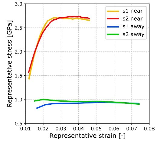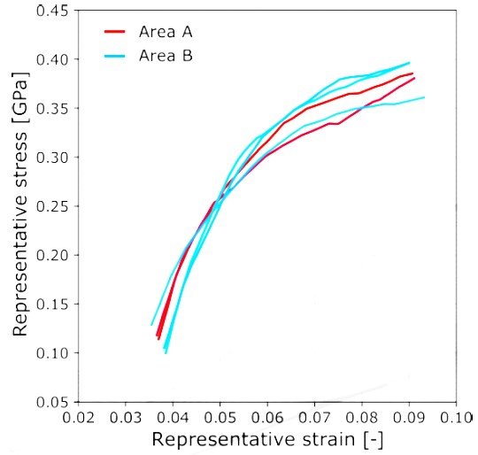 兩個區域表現出相類似的彈塑性行為,屈服應力約為0.3 GPa。這表明焊接過程中加熱和冷卻對材料的彈塑性性能的影響可以忽略不計。然而,并非所有情況下都是如此,焊接區域的局部應力應變行為仍然是優化焊接參數的重要信息。