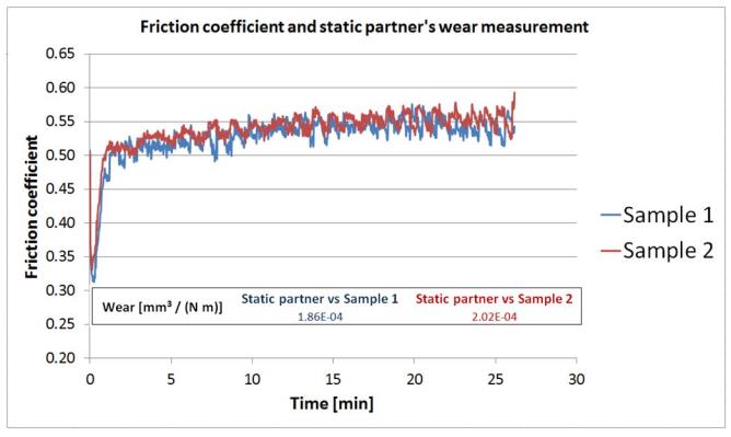 通過(guò)結(jié)果分析,兩種樣品的摩擦系數(shù)相差不大,摩擦系數(shù)隨時(shí)間的變化的曲線(xiàn)趨勢(shì)也相一致