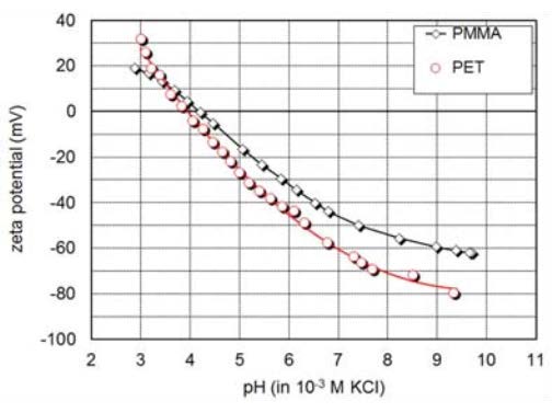 隨著pH降低,惰性聚合物表面如聚甲基丙烯酸甲酯PMMA和聚對苯二甲酸乙二酯PET的負的zeta電位減小并且零電位點IEP在pH 4處。