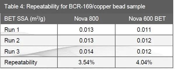 Nova 800 和Nova 600 BET 的結(jié)果如表4 所示。對(duì)于Nova 800,加入了27.9311 g(總表面積0.37 m2)的樣品用于測(cè)量,對(duì)于Nova 600 BET,加入了30.7453 g(總表面積0.36 m2)的樣品用于測(cè)量。所有測(cè)量結(jié)果的BET 相關(guān)系數(shù)都大于0.999。Nova 800 的重復(fù)性為3.54%,Nova 600 BET 的重復(fù)性為4.04%。三種測(cè)量方法的BET 表面積值僅變化0.001 m2/g,但由于整體表面積較低,即使是很小的差異也會(huì)導(dǎo)致重復(fù)性變大, 約3-4%。