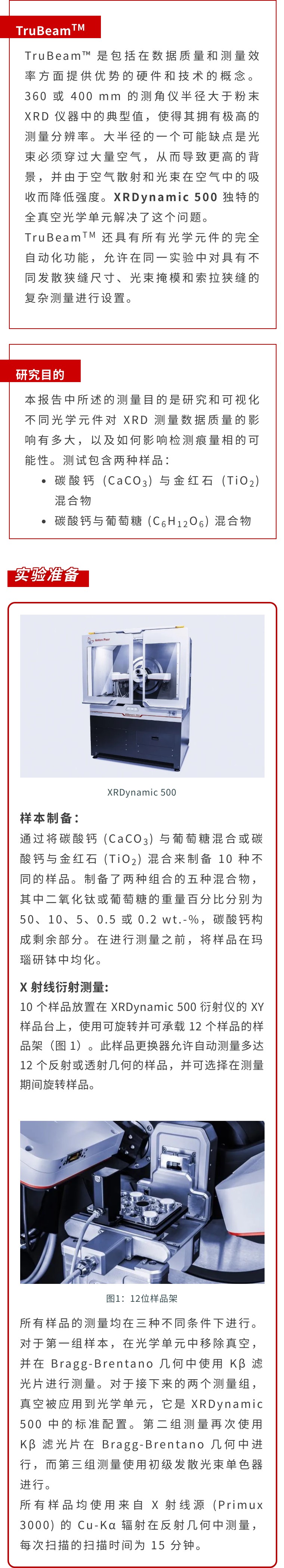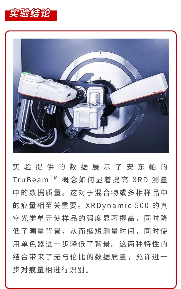 X 射線衍射 (XRD) 是對多晶樣品(如粉末或塊體材料)進行定量和定性分析的標準方法。很難識別材料中包含的所有物相,并量化每個物相的正確相對含量。這在多相體系中尤其如此,其中某些物相只占整個體系的百分之幾。高數據質量、高分辨率和低背景噪音在這方面有很大幫助。Anton Paar 全自動多功能粉末 X 射線衍射儀 XRDynamic 500 是此類測量的完美選擇,因為其專利的TruBeamTM 概念將無與倫比的數據質量和測量效率相結合。