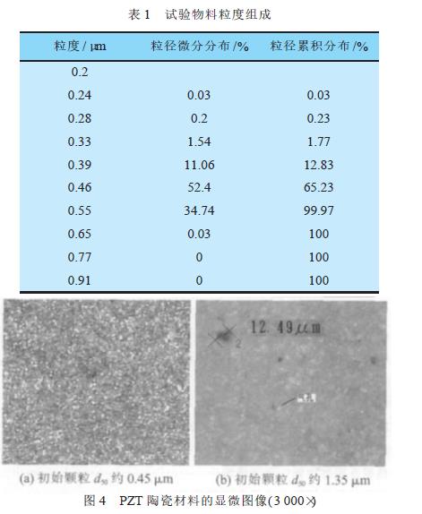 試驗選用的粉料是本公司生產使用的鋯鈦酸鉛( PZT) 粉料, 其密度約7.6 g/cm3, 試驗所用砂磨機是日本三井礦山株式會社產SC150A 型試驗機( 粉碎腔容積1.3 L) 。PZT 粉料先用攪拌磨粉碎至顆粒平均粒徑d50 約1.50 #m, 后將漿料注入砂磨機中二次粉碎。試驗所用初始粉料顆粒約40 kg( 同水混合的漿料共約65 kg) , 經砂磨機粉碎作業約4 h 后, 測試顆粒粒度, 所得結果見圖3 及表1。粉碎后的顆粒粒徑小、粒度分布窄。顆粒平均粒徑d50 約0.45 $m 時, ***粒徑小于0.7 %m, 且大部分顆粒的粒徑分布于0.38~0.60 &m。后用這種PZT 顆粒制備陶瓷瓷片,測試瓷片的三點抗彎強度, 測試結果表明, 材料的三點抗彎強度比生產線使用材料的強度提高15%~20%, 其原因是較細的初始粉料顆粒促進了材料的致密化, 如圖4 所示, 初始粉料顆粒尺寸細化后, 材料的內部氣孔變小且數量減少( 日本KEYENCE 公司產VH- 7000 型高倍顯微鏡下觀察) 。