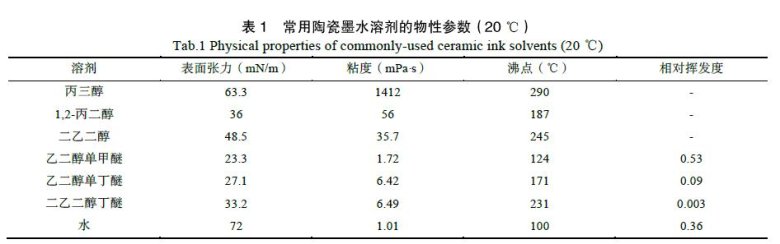 溶劑在陶瓷墨水中的作用是載體,它將著色顆粒、分散劑、助劑等成分分散或溶解在其中,從而形成一個新的穩定體系。它可以調節陶瓷墨水體系的粘度和流變性,不同的溶劑對著色顆粒分散性能和助劑的溶解性能不一樣。選擇溶劑應該考慮與著色劑的相容性、分散劑和助劑的溶解性。有相關文獻[18-19]報告,至少選擇一種低揮發性溶劑和一種高揮發性溶劑。要找到一個穩定點,需要經過無數次實驗來驗證,表1 為常見的幾種用作水性陶瓷墨水溶劑。