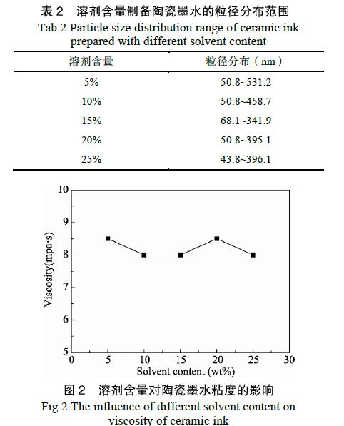 (2)在其他參數不變的情況下,添加分散劑SRE-4026X 制備的陶瓷墨水粒徑***小,達到164 nm,粘度值為19.2 mPa·s,滿足噴墨打印的技術要求。