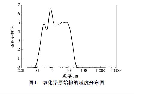 采用共沉淀法[13]制備出氫氧化鋯,經(jīng)由輥道窯烘干、煅燒獲得氧化鋯原始粉。經(jīng)粒度分析( 見圖1) ,氧化鋯原始粉的d50 = 1. 355 μm,d90 = 9. 440 μm。