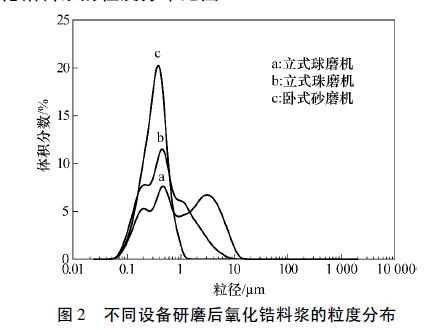 2. 1 不同研磨設(shè)備對(duì)研磨效果的影響采用不同設(shè)備在相同研磨條件下研磨得到的氧化鋯料漿的粒度分布見圖2。