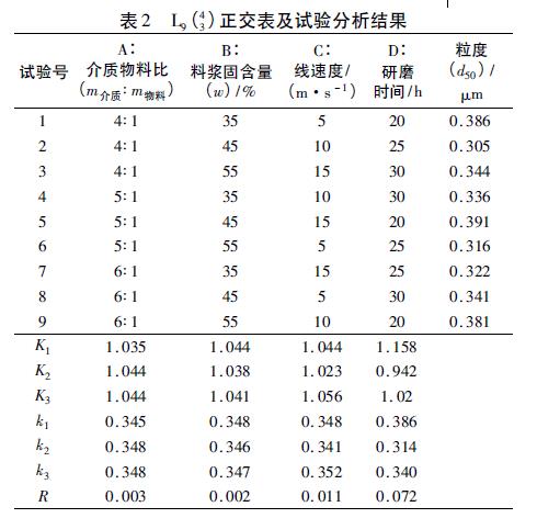 為了研究不同研磨設(shè)備及研磨工藝參數(shù)對(duì)粉體團(tuán)聚體的解聚效果,以d50 = 1. 355 μm 的氧化鋯粉為研究對(duì)象,首先分別采用立式球磨機(jī)、立式珠磨機(jī)和臥式砂磨機(jī)在相同研磨條件下進(jìn)行研磨試驗(yàn),以確定***研磨設(shè)備; 然后采用***研磨設(shè)備,選擇介質(zhì)物料比、料漿固含量、線速度和研磨時(shí)間作為試驗(yàn)因素,進(jìn)行四因素三水平正交試驗(yàn),以確定***研磨工藝參數(shù)。