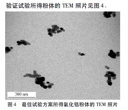 對(duì)***組合A1B2C2D2進(jìn)行了3 次驗(yàn)證試驗(yàn),結(jié)果分別為0. 309、0. 312 和0. 310 μm,平均值為0. 310μm,重復(fù)性好,且與2 號(hào)正交試驗(yàn)結(jié)果0. 305 μm 接近,驗(yàn)證了所選***工藝參數(shù)的合理性。驗(yàn)證試驗(yàn)所得粉體的TEM 照片見圖4。