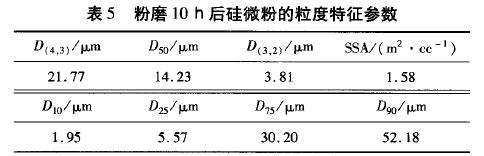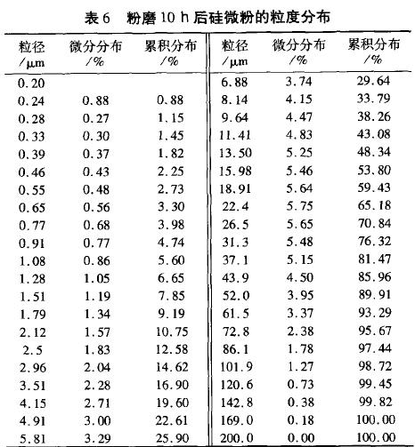 由表5可知,粉磨10 h后硅微粉的中位徑D 。是14.23/a,m。由表6可以看出,硅微粉的粒徑為22。4Ixm時的微分分布***,為5.75% ;***粒徑169.0m,其對應的微分分布為0.18%。