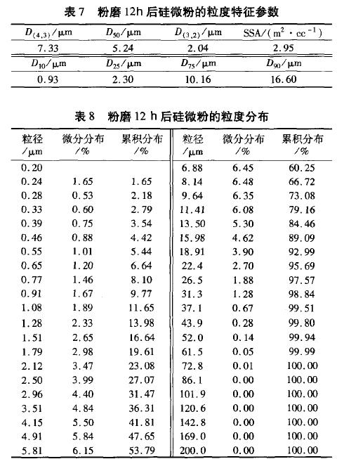 由表7可以看出,粉磨12 h后硅微粉的中位徑D 是5.24 Ixm。由表8看出,硅微粉的粒徑為8.14 m時的微分分布***,為6.48% ;***粒徑72.8 I.Lm,其對應的微分分布為0.01%。不經分級可以獲得百分含量占99.99% 、粒徑為61.5 Ixm以下的硅微粉。