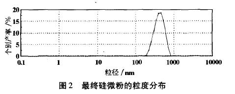 由表1可知,粉磨6 h后硅微粉的中位徑,) 。是32.50 m。由表2可看出,粉磨6 h后硅微粉的粒徑是43.9 m時的微分分布***,是7.17% ;***粒徑是169.0 m,對應的微分分布為1.07%。