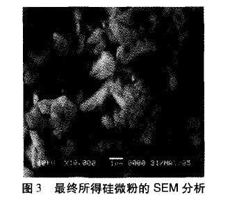 將***終所得硅微粉在掃描電子顯微鏡下進行形貌觀察,照片見圖3。由圖3可以看出,絕大部分硅微粉的粒徑在1 m以下,且多數顆粒粒度均勻、形貌呈不規則的角礫狀,僅有少數顆粒呈針狀,但是呈球形的顆粒很少。這主要是因為粉磨介質球和物料在攪拌器的驅動下作無規則的多維循環運動和自轉運動,物料在介質球的沖擊力、剪切力、研磨力等多種作用力下,不斷被粉碎所致。加之石英晶粒力學性能上的多向異性,也可能導致這種現象的發生。