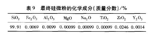 ***終硅微粉的化學成分見表9。由表9可知,***終硅微粉的SiO,含量可達到99.9l% ,其它組分含量很低,已達到和超過環氧塑封料等用途的硅微粉品質要求。***終硅微粉被污染的程度小,由于研磨介質球磨損帶進的ZrO 雜質僅占0.0246% ,帶進的Y O 雜質為0.0014%