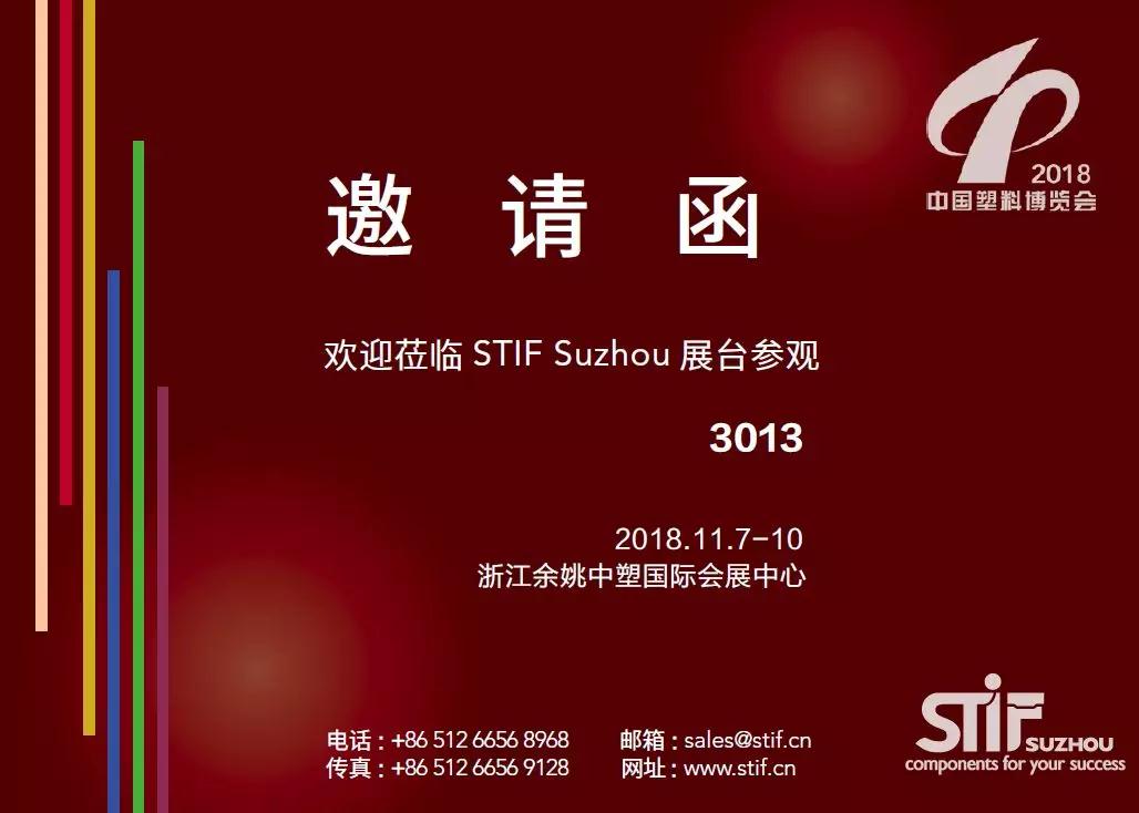 2018中國(余姚)國際塑料博覽會暨第二十屆中國塑料博覽會于11月7-10日在浙江余姚中塑國際會展中心隆重舉行,斯緹福機械(蘇州)有限公司(股票代碼:691677)邀請您參觀“2018余姚塑料博覽會”,展位號:3013。