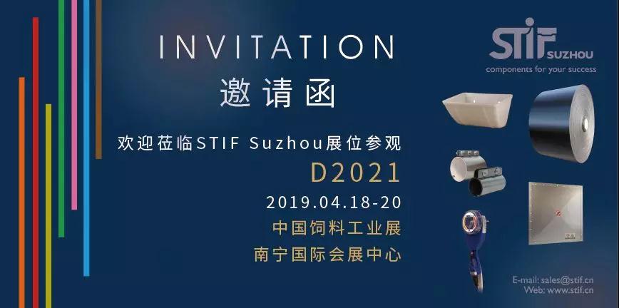 以“合作共贏、綠色發展”為主題的2019中國飼料工業展覽會定于2019年4月18-20日在廣西南寧國際會展中心舉行,散裝物料配件制造商--斯緹福機械(蘇州)有限公司應邀亮展,展位號:D2021,誠邀您的光臨。