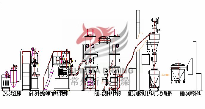 此次出口柬埔寨成套制粒聯(lián)動(dòng)線設(shè)備包含高速混合制粒機(jī)(含KZL-300)、沸騰制粒機(jī)、噴嘴制粒系統(tǒng)等。(下圖為制粒聯(lián)動(dòng)線設(shè)計(jì)方案參考圖)