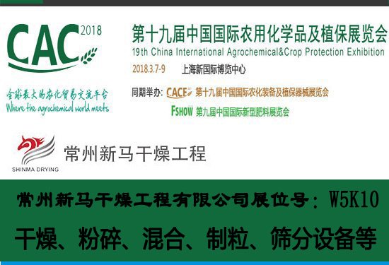 第十九屆中國國際農(nóng)用化學(xué)品及植保展覽會CAC2018于今日(3月7日)在上海新國際博覽中心拉開帷幕。據(jù)悉,將來自30個國家和地區(qū)的近1400家企業(yè)參展。常州新馬干燥工程有限公司亮相此展,屆時將在W5K10展位現(xiàn)場展示高速離心噴霧干燥機等拳頭產(chǎn)品。