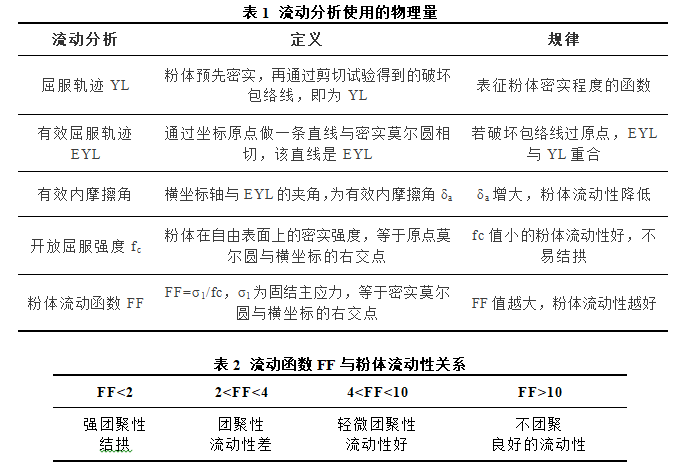 粉體的流動性決定了粉體在粉碎生產過程中的連續性,直接影響粉碎后的粒徑分布。在氣流粉碎過程中,原料藥粉體的儲存部位包括緩沖料倉、進料器、旋風分離筒和收集器,在粉碎過程中進料器的原料藥顆粒只有源源不斷地流動、補充,形成連續的狀態,才能圓滿完成給料、粉碎等任務。一般情況下,粉碎前的初始粒度小、比表面積大、表面粗糙、形狀不規則、水分含量高的粉體流動性差,可以通過造粒、表面改性、機械磨拋、干燥等方式來改善。另外,粉體的流動性不僅與粉體本身相關,還與料倉的材質、結構等關系密切。料倉內粉體的流動性可以采用下表的物理量進行分析。