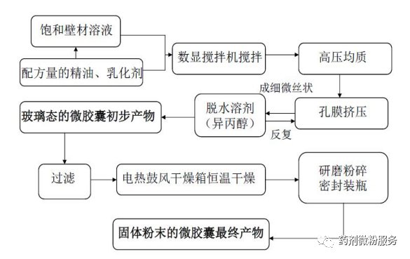 首先配置壁材飽和水溶液,再添加入精油和乳化劑,進行均質乳化,最后使液體混合物,經過一系列孔膜的作用,并將其擠進一種脫水溶劑(通常為異丙醇)中。當被孔膜擠壓出來的乳狀液接觸到脫水溶劑,此時壁材也會隨之脫水硬化,并包覆在芯材的表面。經過過濾,將微膠囊粗產品從脫水溶劑異丙醇中分離,即可得到玻璃態的包埋產 物;也可以繼續進行干燥研磨,得到粉末狀的包埋產物。