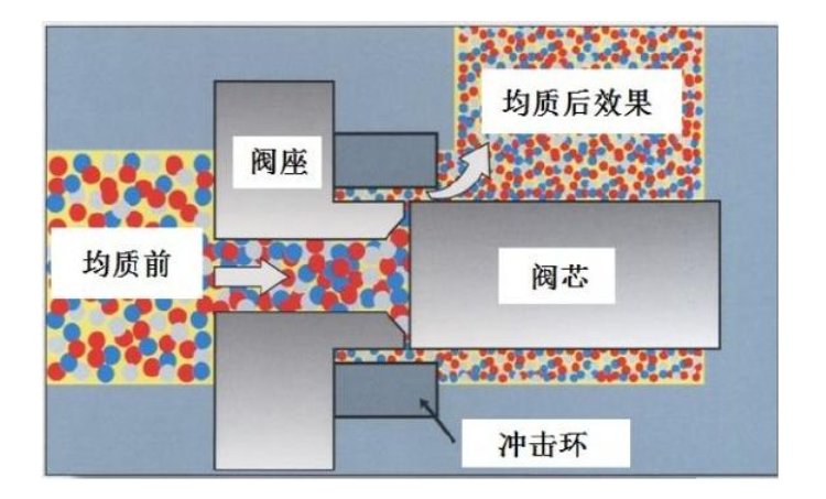 經(jīng)過縫隙的液體,由于瞬間失壓以極高的速度噴射出,撞擊到均質(zhì)部件上,產(chǎn)生了剪切、撞擊和空穴三種效應(yīng)。