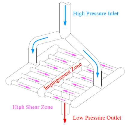 “Z”型均質(zhì)腔,物料流在高速通過微管通道時(shí)受到的高剪切力首先將自身粒徑減小,緊接著其與均質(zhì)腔內(nèi)壁產(chǎn)生的高碰撞力進(jìn)一步對(duì)物料進(jìn)行去團(tuán)聚、松團(tuán)作用,有利于降低粒徑分布、去團(tuán)聚、分散等作用