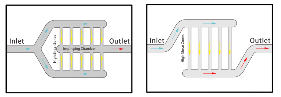 微射流均質(zhì)機(jī)核心部件,其內(nèi)部固定的幾何角度構(gòu)造對(duì)成品起到直接的作用。現(xiàn)基本采用“Y”型或“Z”型構(gòu)造的均質(zhì)腔。