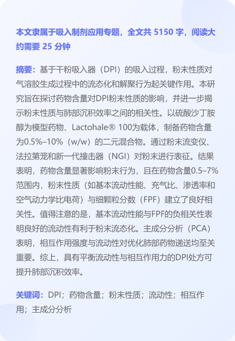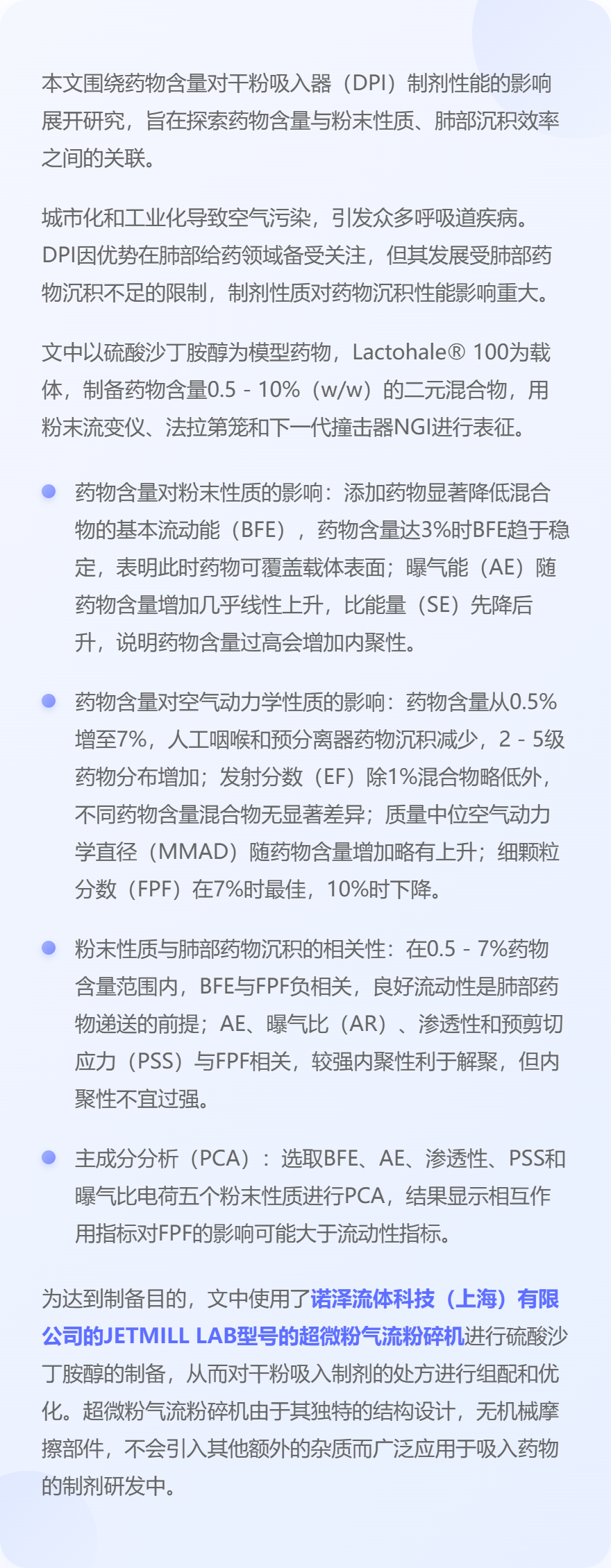 [1] Sun Y ,Qin L ,Liu C , et al. Exploring the influence of drug content on DPI powder properties and potential prediction of pulmonary drug deposition [J]. International Journal of Pharmaceutics, 2020, 575 119000.