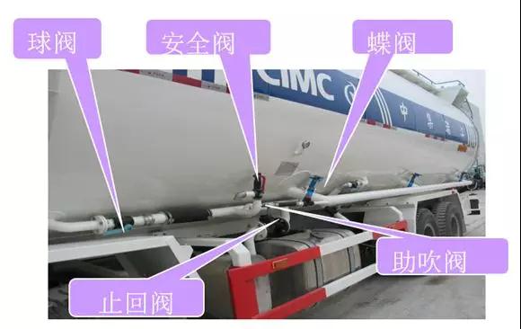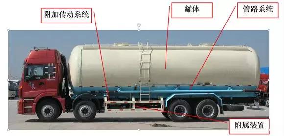 上裝主要包括附加傳動系統(tǒng)、罐體總成、管路系統(tǒng)、附屬裝置等四部分,下圖為粉罐車的外部結構圖。