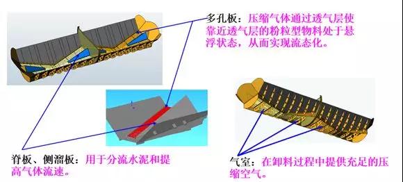 多孔板和側溜板與水平面成一定角度的夾角。流化布用螺栓壓緊在多孔板上。流化布下面形成封閉的氣室,各個艙的氣室是不相通的,前后艙可以獨立卸料。