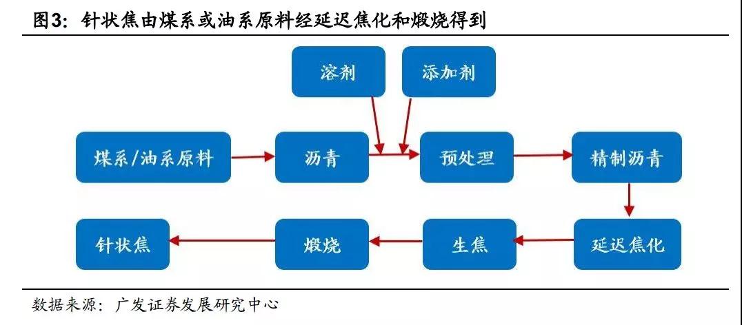 針狀焦:針狀焦是外觀具有明顯纖維狀紋理、熱膨脹系數(shù)特別低和很容易石墨化的一種優(yōu)質(zhì)焦炭。針狀焦物理性能的各向異性十分明顯,平行于顆粒長(zhǎng)軸方向具有良好的導(dǎo)電導(dǎo)熱性能和較低的熱膨脹系數(shù),因此針狀焦是制造高功率或超高功率石墨電極的關(guān)鍵原料,制成的石墨電極電阻率較低,熱膨脹系數(shù)小,抗熱震性能好。針狀焦按原料來源可分為以石油渣油為原料生產(chǎn)的油系針狀焦和以精制煤瀝青原料生產(chǎn)的煤系針狀焦兩種。根據(jù)張毅峰2013年發(fā)表于《炭素技術(shù)》期刊上的《針狀焦與石墨電極》一文,國外炭素企業(yè)生產(chǎn)大規(guī)格高功率和超高功率石墨電極往往首選優(yōu)質(zhì)油系針狀焦為主要原料焦,目前我國針狀焦以煤系針狀焦為主,油系針狀焦依賴于從日本水島公司和英國HSP公司進(jìn)口