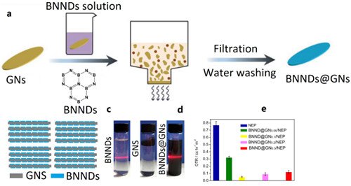 圖1(a)BNNDs在石墨烯表面的沉積過程,(b)BNNDs@GNs復合片,(c)BNNDs及石墨烯的分散行為,(d)改性石墨烯聚合物涂層的屏蔽性