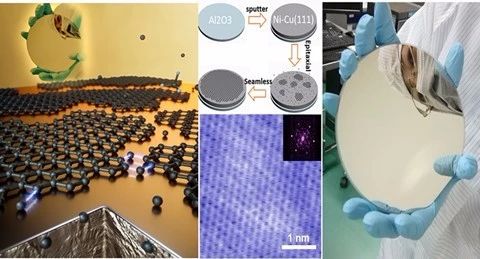 左圖:石墨烯單晶晶圓生長設計及實驗結果;右圖:低溫制備的6英寸石墨烯單晶晶圓