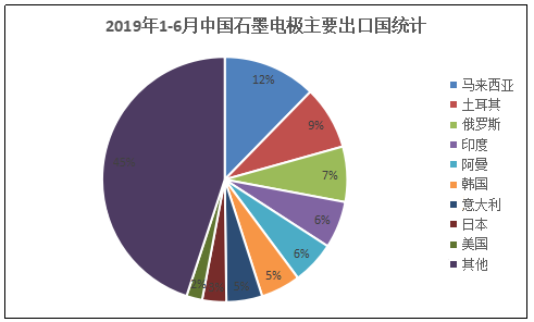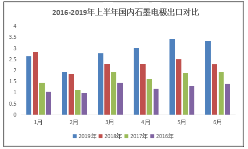 從量上來看,2019年1-6月國內石墨電極月均出口量高于過去三年,尤其是今年,出口量增量非常明顯,可見近兩年中國石墨電極在海外市場出貨量呈現上升趨勢。