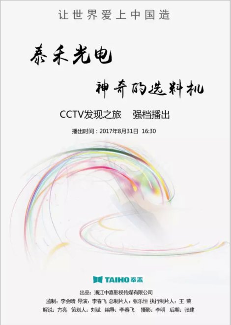 2017年8月31日 16:30,泰禾光電 神奇的選料機(jī)CCTV發(fā)現(xiàn)之旅《工匠精神》強(qiáng)檔播出,敬請(qǐng)期待!