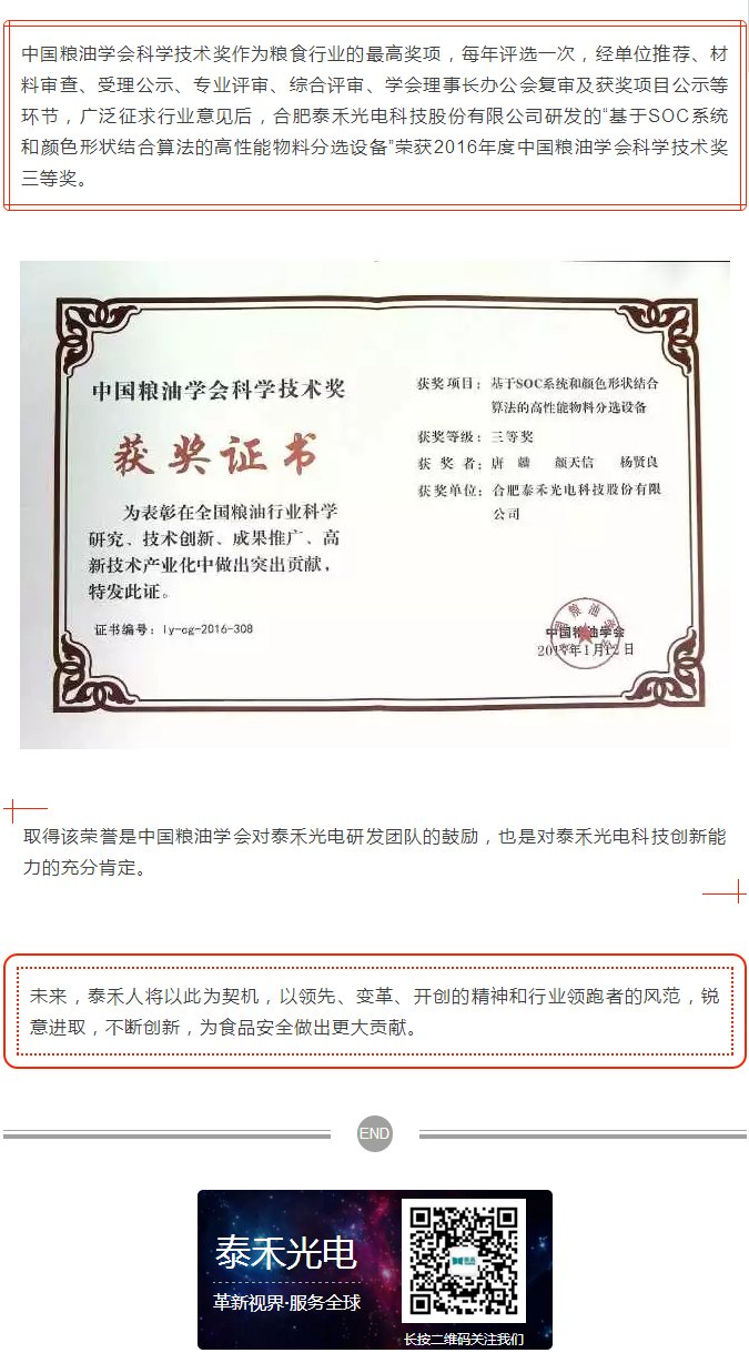 【喜訊】泰禾光電榮獲2016年度中國糧油學會科學技術獎