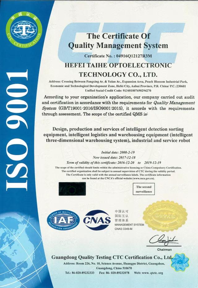 泰禾光電成立至今,始終堅持追求匠心品質,誠信自律、守法經營。在質量管理體系法律法規的引導下、多項國際權威認證的保駕護航之下,泰禾光電產品日臻完美,得到社會認可、全球認可。公司旗下的三大系列產品——智能彩色CCD色選機、智能工業機器人、智能立體倉儲系統,為實現更安全、更健康的優質糧油等產品提供了強有力的保障。