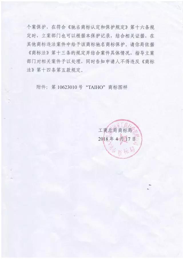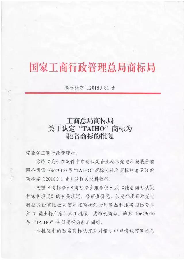 2018年,合肥泰禾光電科技股份有限公司根據《商標法》《商標法實施條例》及《馳名商標認定和保護規定》有關規定,向國家工商總局商標局提出申請,請求認定“TAIHO”注冊商標為馳名商標。國家工商總局商標局經過嚴格審查,依法認定該商標為馳名商標。
