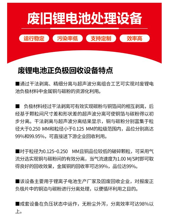 鋰電池處理設(shè)備與鋰電池回收處理設(shè)備是環(huán)保設(shè)備,種類型號齊全,應(yīng)用廣泛,技術(shù)成熟,是非常實用可行的廢舊三元鋰電池,一元鋰電池,磷酸鐵鋰電池的拆解與回收銅,鋁,鈷酸鋰金屬等隔膜分離的回收技術(shù),能夠?qū)︿囯姵刂械母黝惤饘偃祷厥?,其實用的性能特點如下: