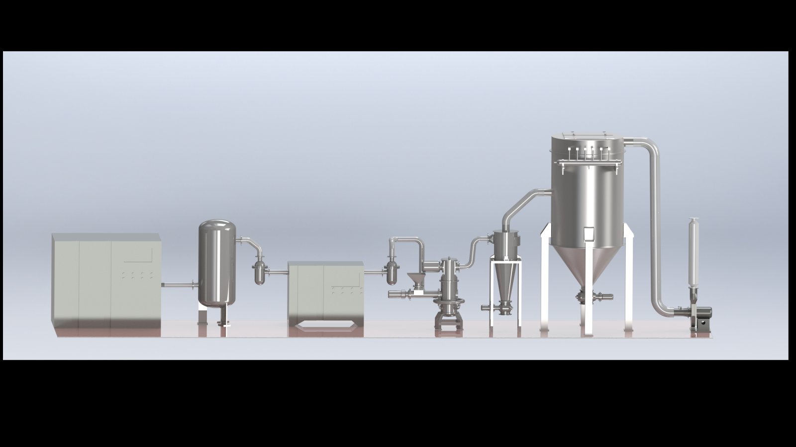 此氣流粉碎機系統由空壓機、儲氣罐、精密過濾器、空氣冷凍干燥機、流化床氣流粉碎機、旋風分離器、除塵器、引風機、星型出料閥等組成.