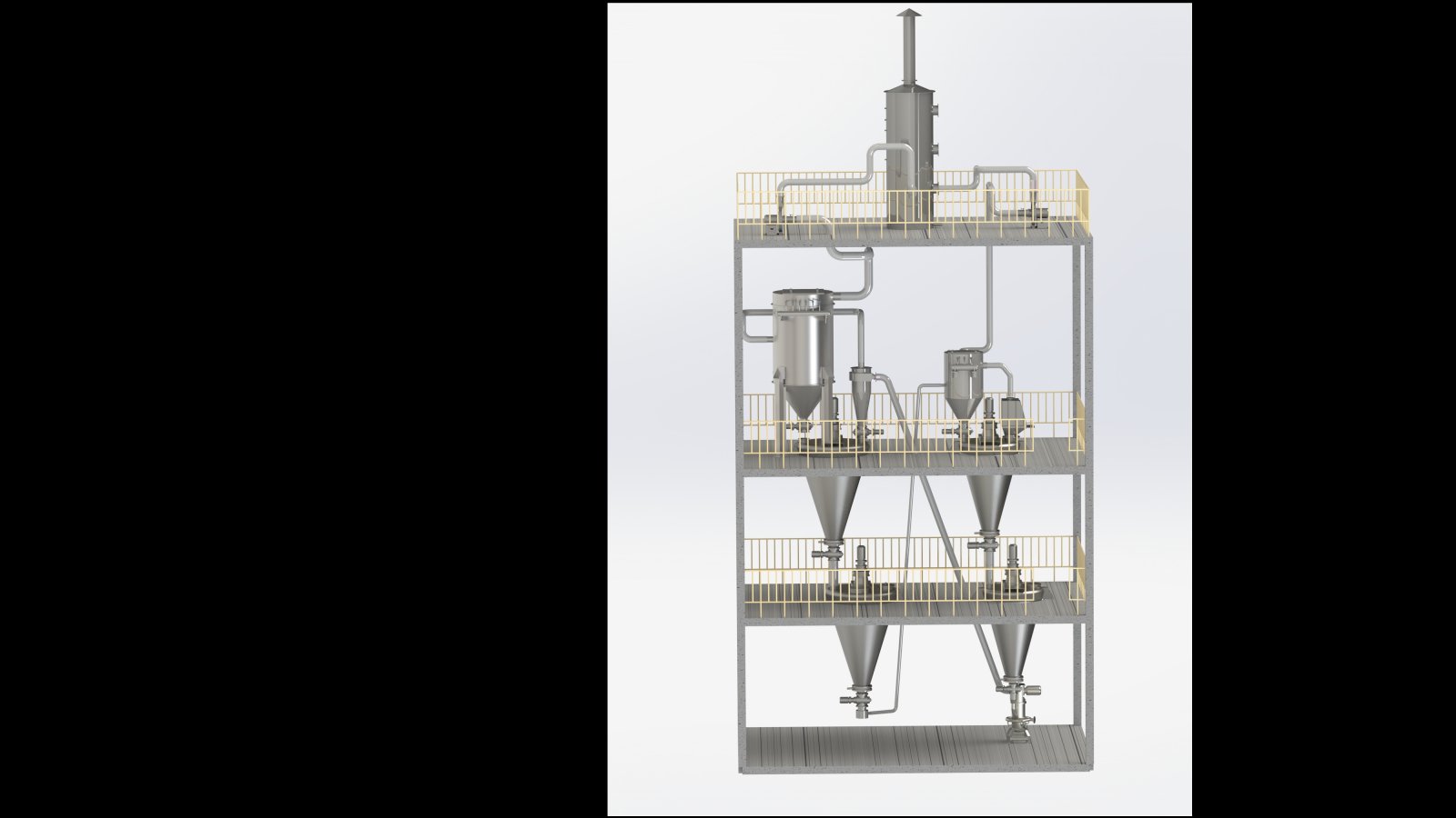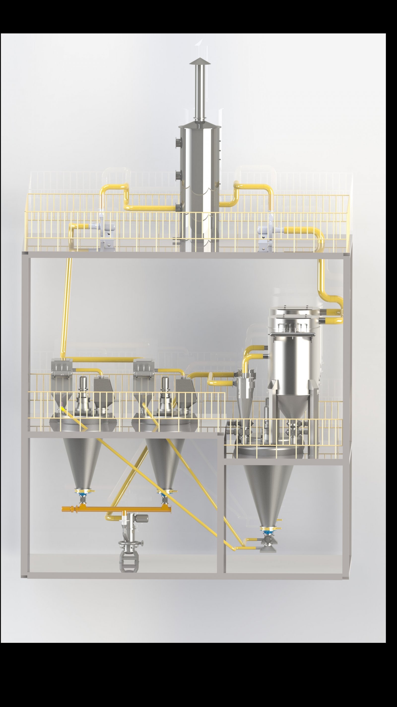 此氣流粉碎機系統由空壓機、儲氣罐、精密過濾器、空氣冷凍干燥機、流化床氣流粉碎機、混合機、投料裝置、旋風分離器、除塵器、引風機、水膜除塵器、星型出料閥等組成,可實現農藥連續生產。